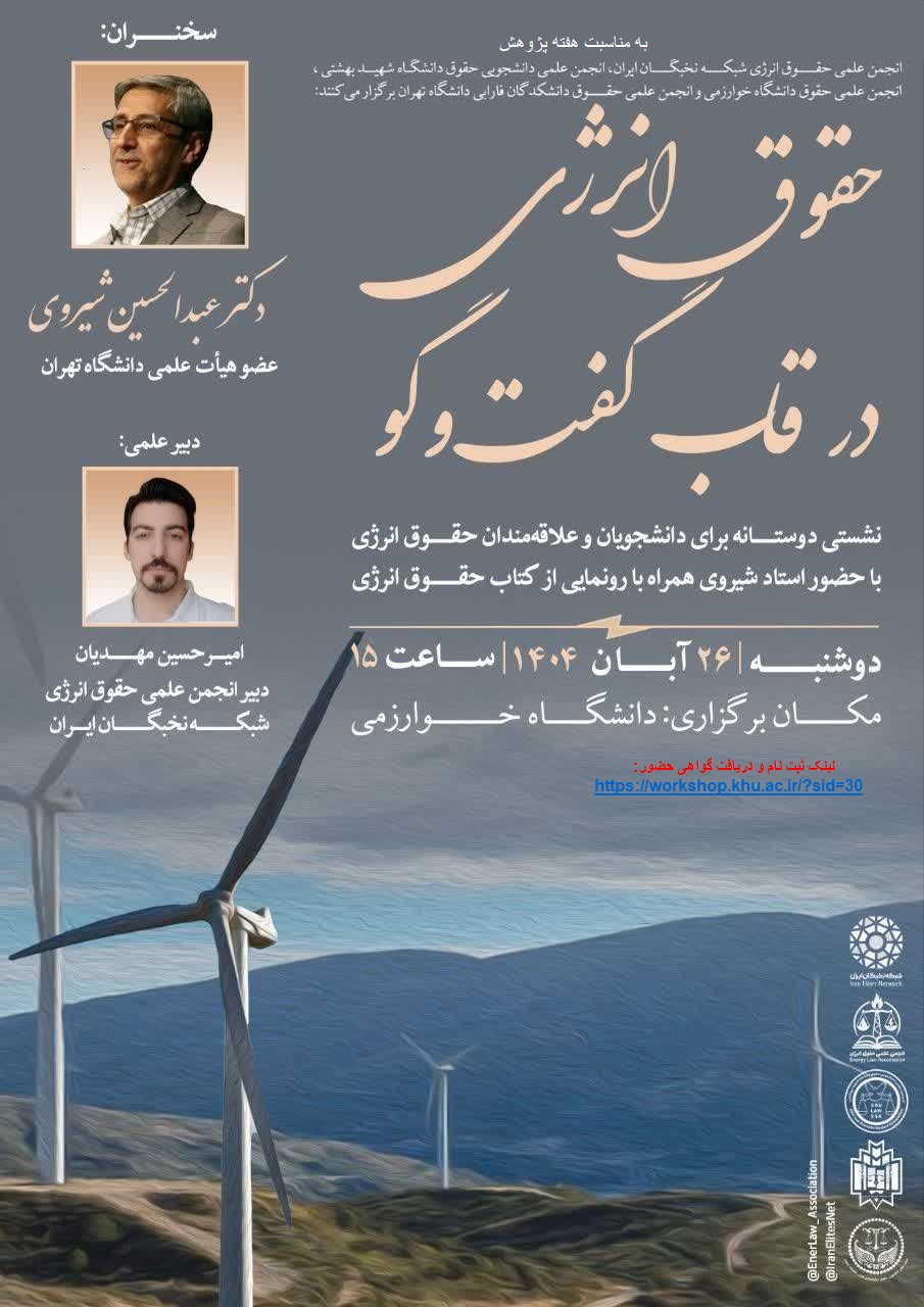 🔵 انجمن علمی دانشجویی حقوق دانشگاه شهید بهشتی، انجمن علمی حقوق انرژی شبکه نخبگان ایران، انجمن علمی حقوق دانشگاه خوارزمی و انجمن علمی حقوق دانشکدگان فارابی دانشگاه تهران برگزار میکنند:
